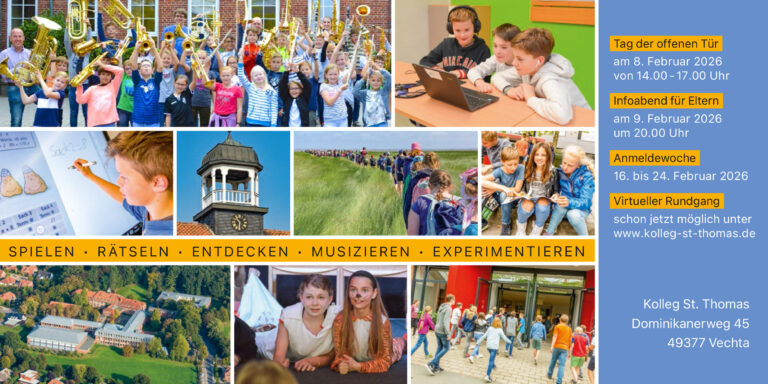 Entdecker sind hier genau richtig. Auf dieser Seite kannst du das Kolleg St. Thomas erkunden: Du entdeckst die Schule und die spannende Umgebung, lernst Schülerinnen und Schüler kennen, erlebst Unterricht und das Leben unserer Schulgemeinschaft, siehst schon einige Lehrerinnen und Lehrer, kannst rätseln und kombinieren… und vieles mehr!